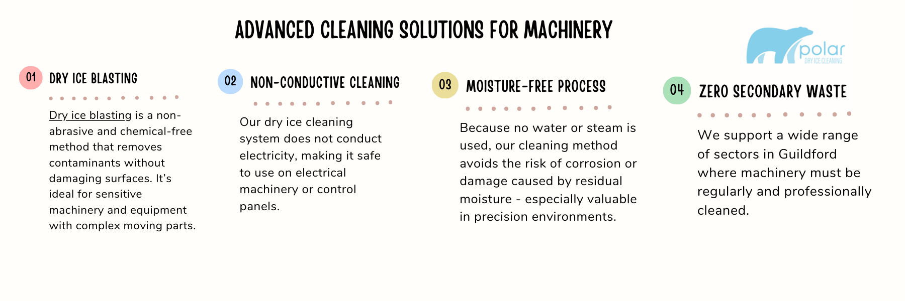 Regular and effective machinery cleaning maintains safety, efficiency and performance across Guildford’s diverse industries. From food production facilities to workshops and commercial premises, machinery that is free from carbon build-up, grease, dust or contaminants lasts longer and performs better. At Polar Dry Ice Cleaning Limited, we deliver professional, non-abrasive machinery cleaning services throughout Guildford and the surrounding areas.